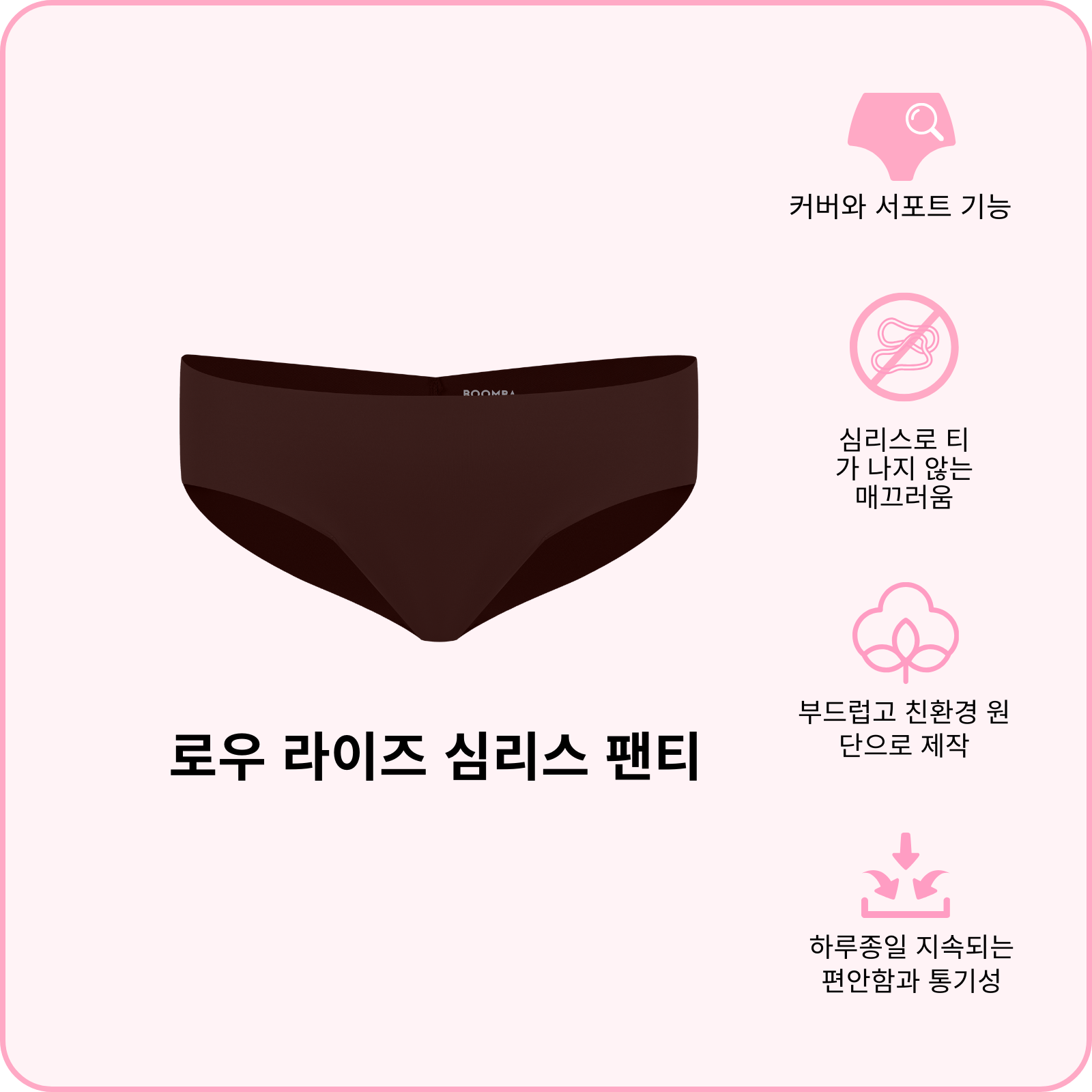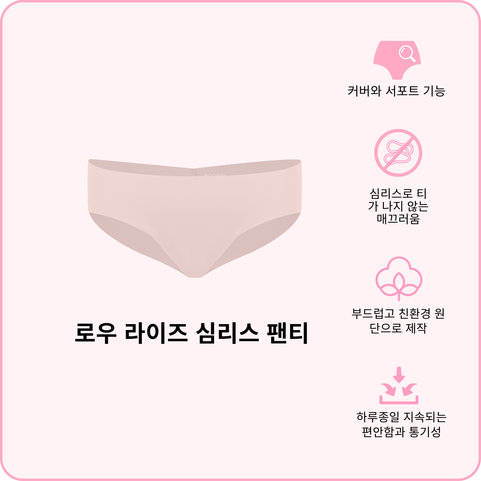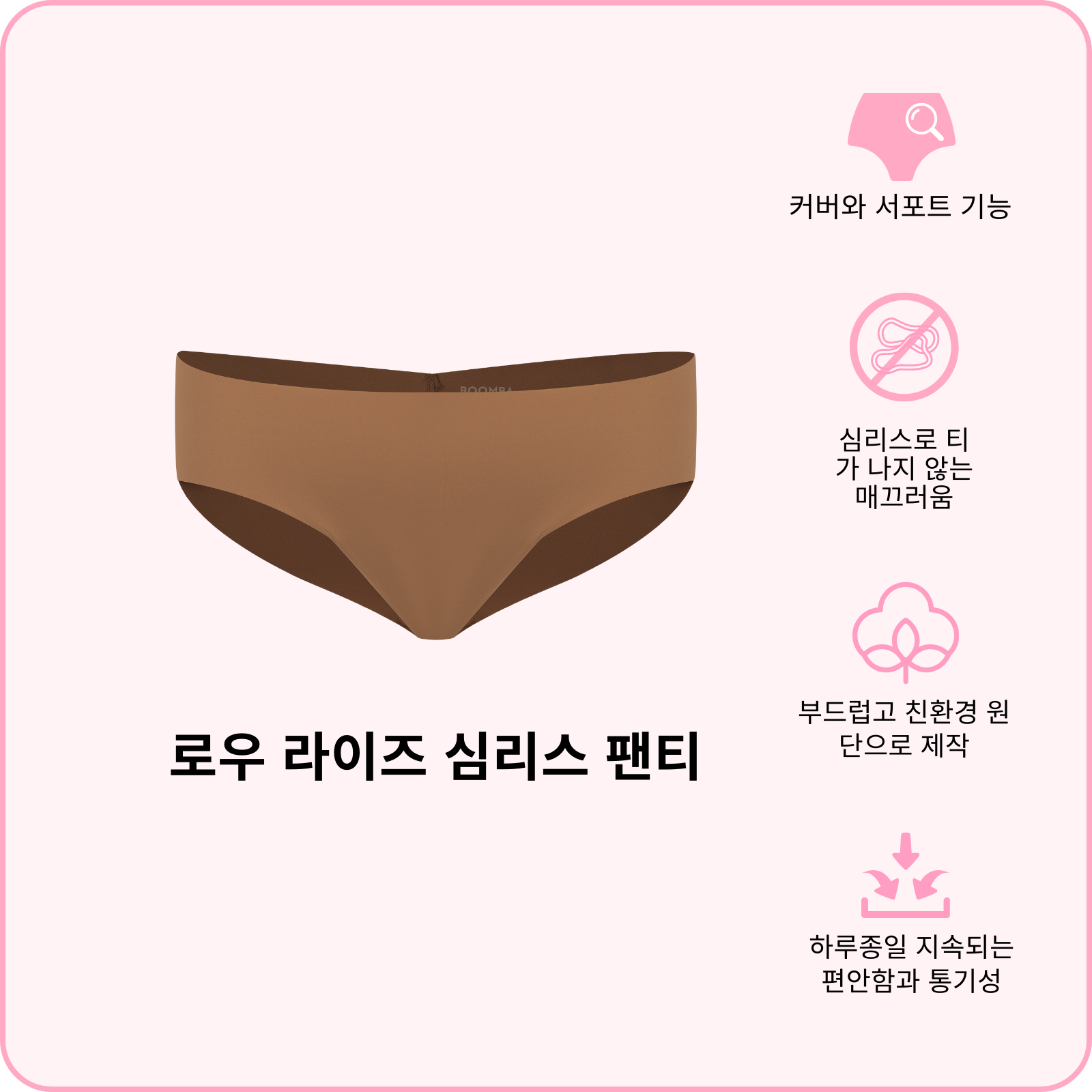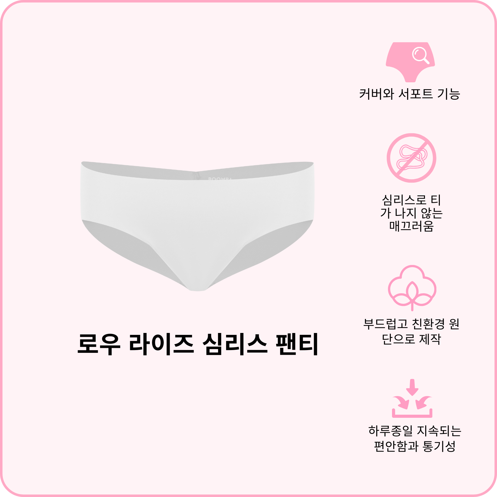 BOOMBA 로우 라이즈 심리스 팬티는 여러분이 잘 간직해야할 비밀 아이템입니다. 매우 부드럽고, 매끈하고, 정말 편안해요! 로우 라이즈 핏과 통기성 있는 원단은 옷을 입었을 때 티가 나지 않는 매끄러운 룩을 연출할 수 있게 합니다. 딱 붙는 옷이나 일상복에 착용해보세요. 편안하면서 예쁜 아이템을 만나보세요