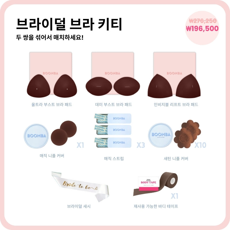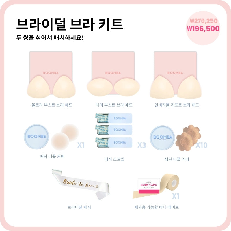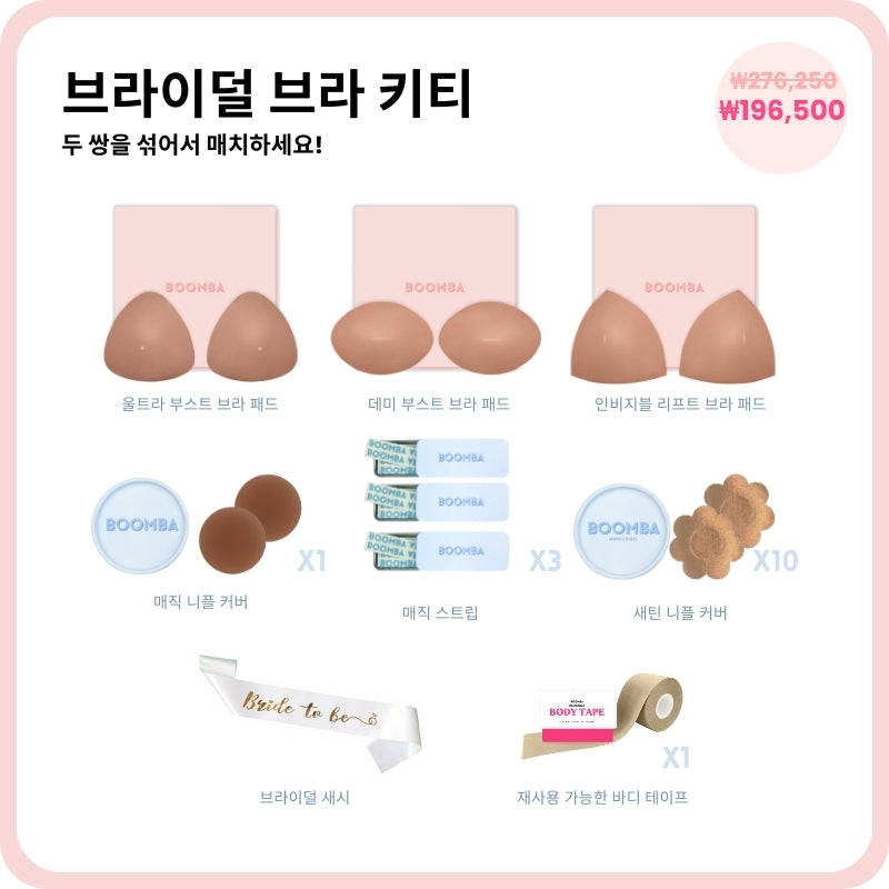 신부가 필요로 하는 모든 것을 갖춘 BOOMBA의 브라이덜 브라 키트 번들로 완벽한 결혼 준비를 하세요. 가슴노출을 방지하는 것부터 더 멋진 몸매를 만들어 줄 수 있으며, 이 번들로 당신을 커버해 줄 것입니다.