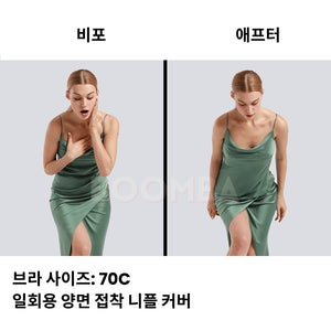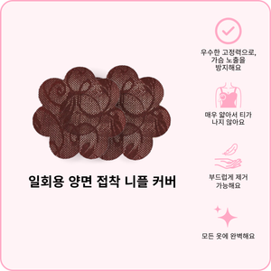 세계 최초 일회용 양면 접착 니플 커버 커버로 한 쪽은 옷에 부착, 다른 한 쪽은 피부에 부착되도록 디자인된 제품입니다. 옷을 입어도 티나지 않게 유지할 수 있습니다.