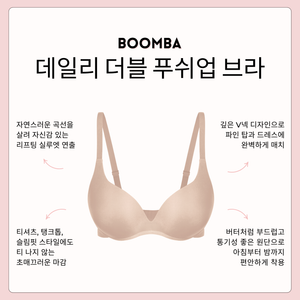 완벽한 푸쉬업 브라를 만나보세요. BOOMBA의 데일리 더블 푸쉬업 브라입니다. 가슴 리프팅, 가슴 보정 효과로 더욱 돋보이게 해주는 이 더블 푸쉬업 브라는 하루 종일 편안한 착용감과 동시에 가슴 볼륨업과 서포트가 가능합니다. 깊게 파인 의상과 잘 어울려 V넥이나 로우컷 의상과 잘 맞으며, 당신이 꿈꿔왔던 가슴골을 선사하는 브라입니다.