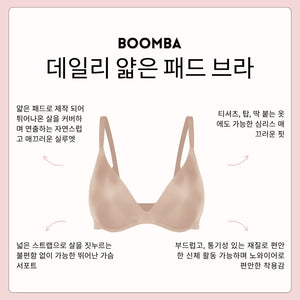 BOOMBA의 새로운 데일리 브라를 만나보세요. 마치 피부처럼 편안하게 디자인된 노와이어 브라는 얇은 패드와 넓은 스트랩으로