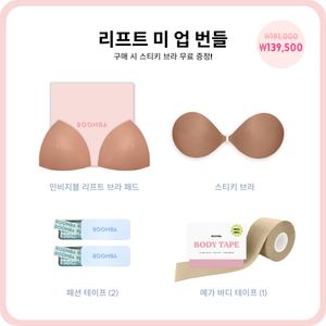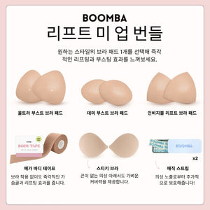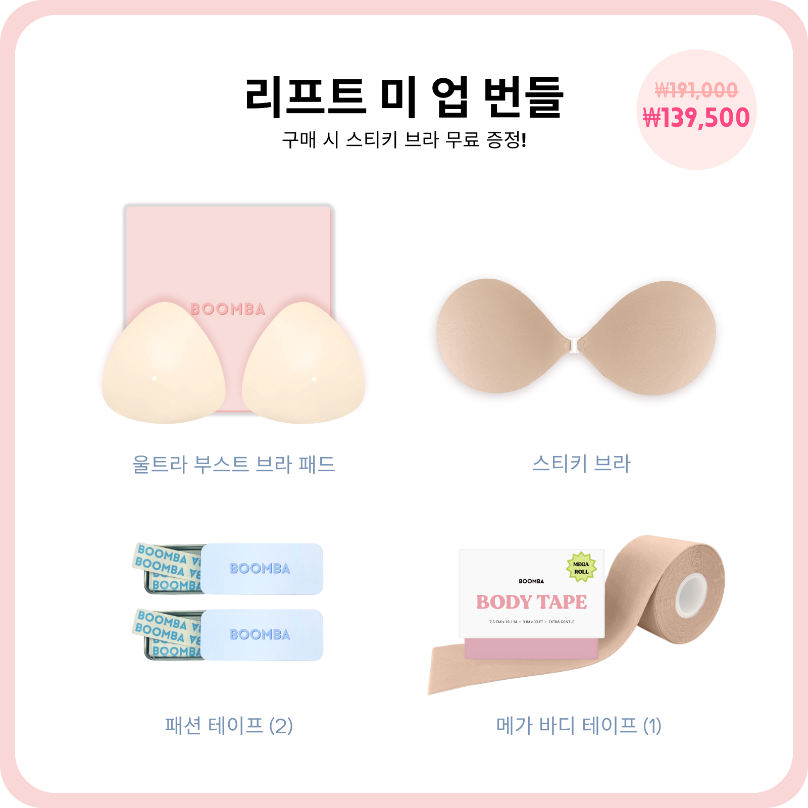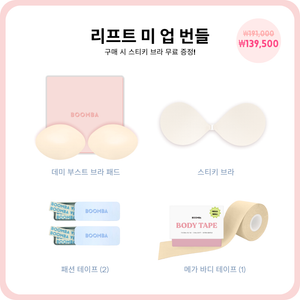 더 볼륨감 있는 가슴골을 만들고 싶다면! 안정감 있는 착용을 원한다면! 이 번들이 적합합니다. 이 번들에는 원하는 BOOMBA 브라 패드 1쌍, 스티키 브라 1개, 패션 테이프 2통, 메가 바디 테이프 1개가 포함되어 있습니다. 자연스러운 볼륨감을 주는데 도움을 줍니다.