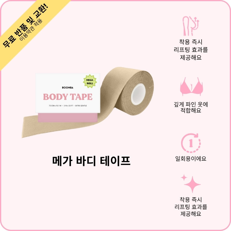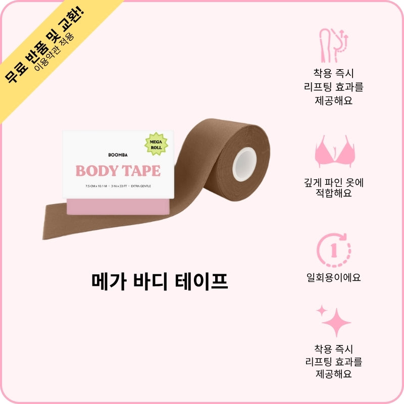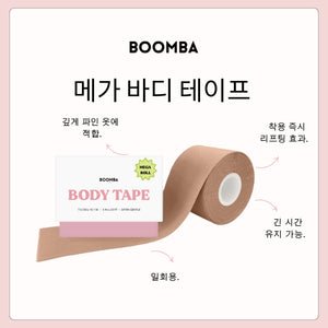 BOOMBA의 메가 바디 테이프 는 다양한 방법으로 사용할 수 있습니다. 체형에 맞게 디자인되었으며 부드러우면서도 강력하여 최대 12시간의 지속력을 가지고 있습니다.