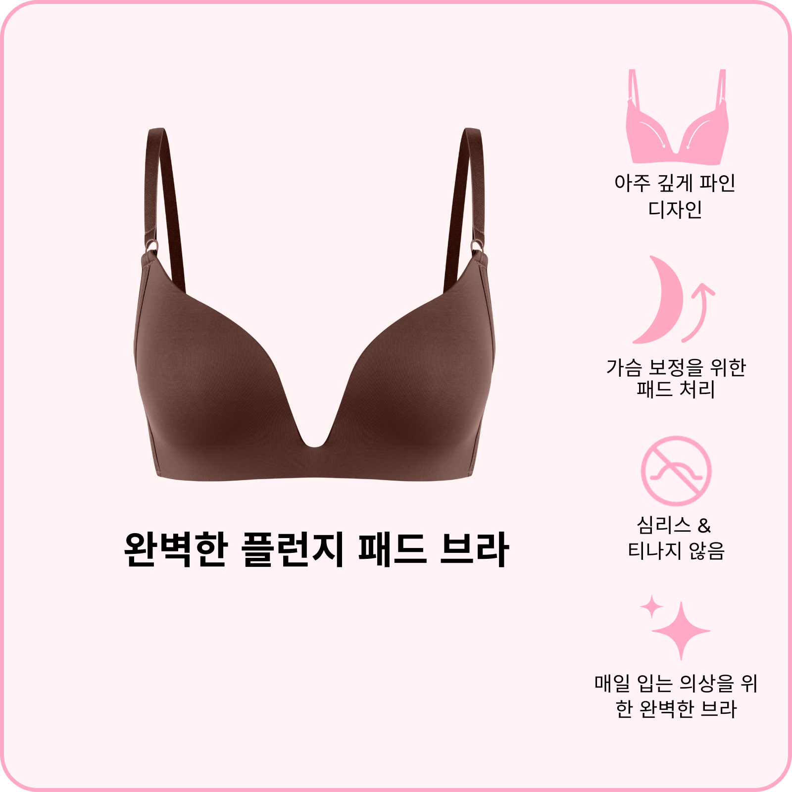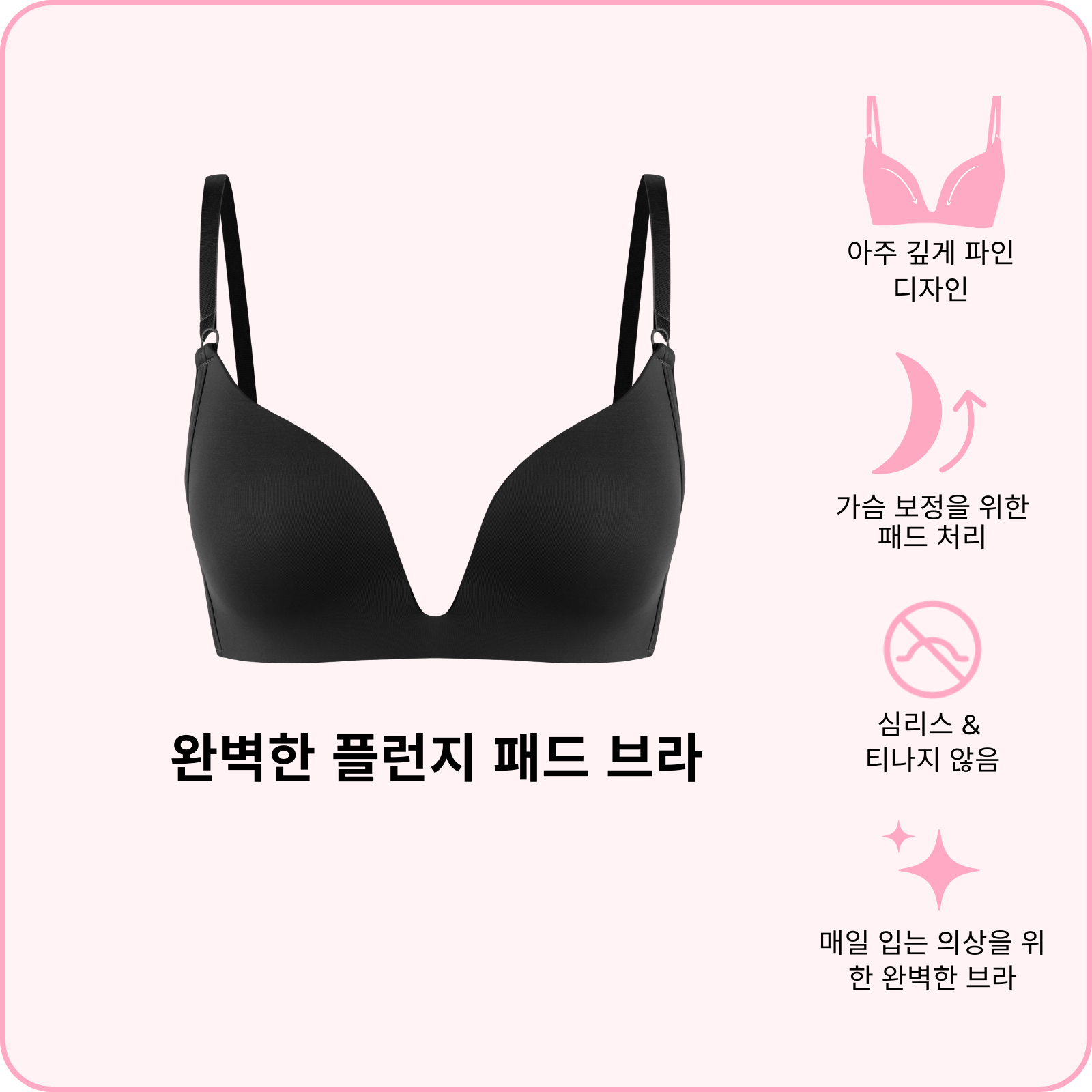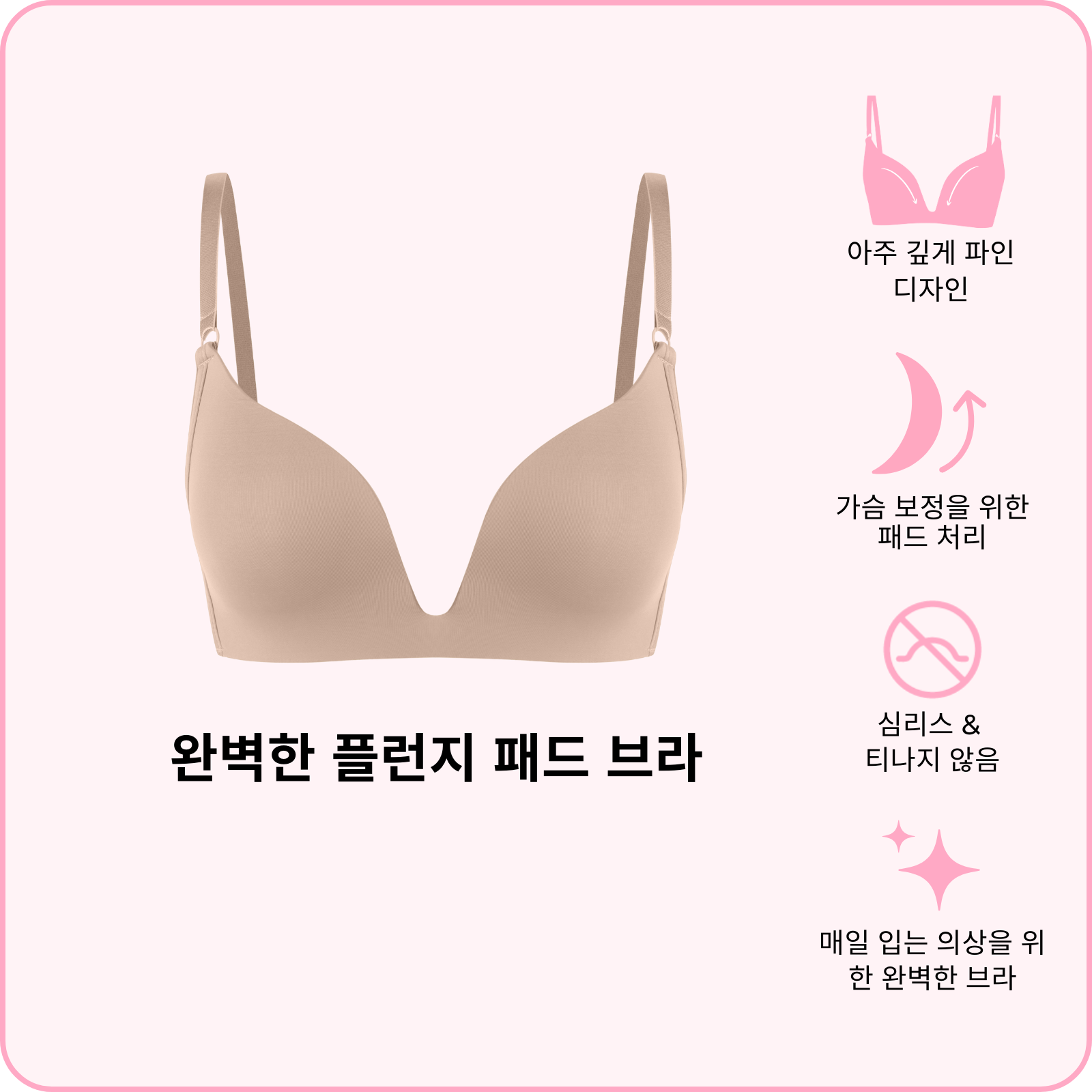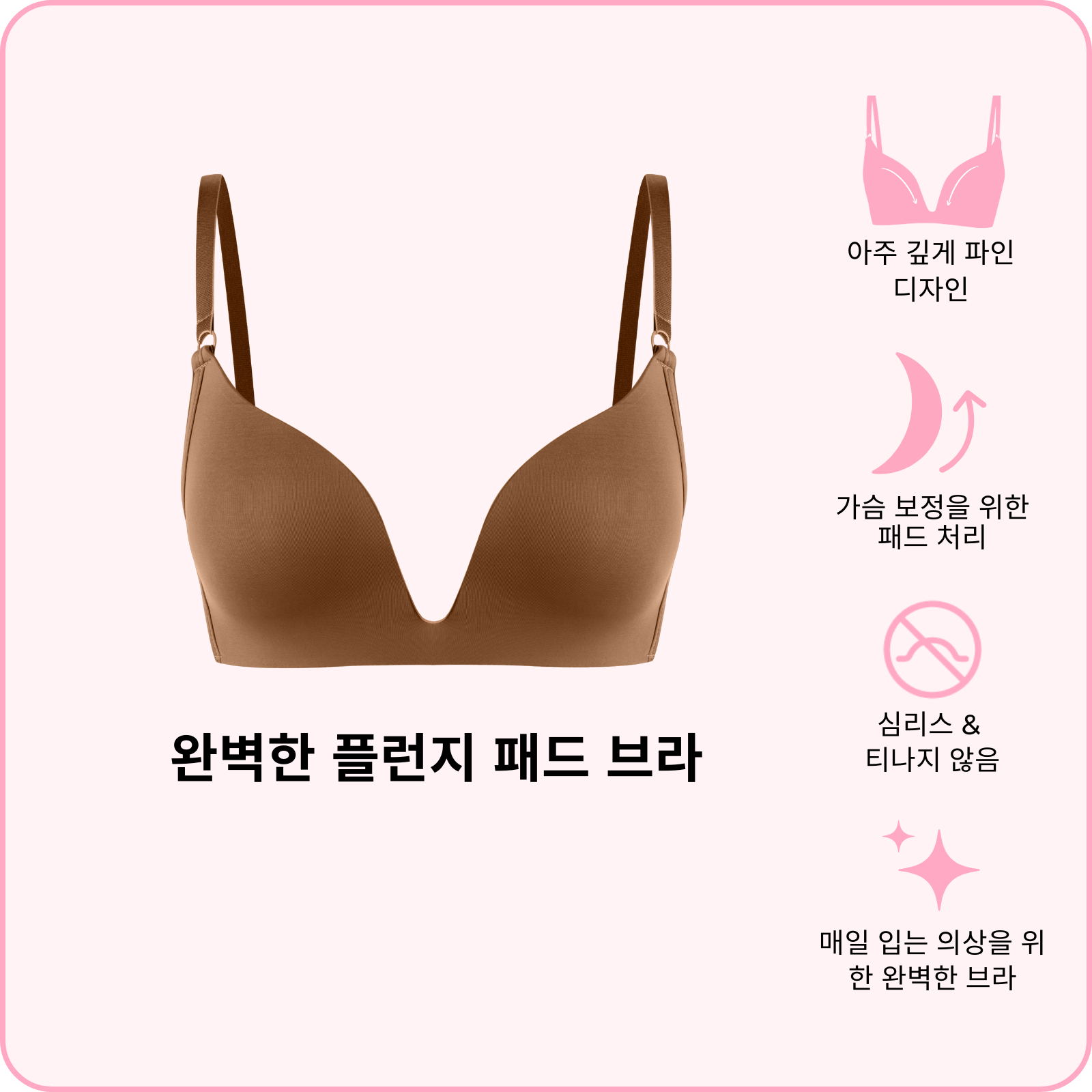 가슴 서포트와 스타일? 하나만 고를 필요는 없어요. 완벽한 플런지 패드 브라는 편안함, 가슴 서포트, 스타일이 완벽한 조화를 이루는 최고의 브라입니다. 단독으로 입어도 아름다우며, 좋아하는 옷 안에 입어도 완벽한 스타일이 완성됩니다.
