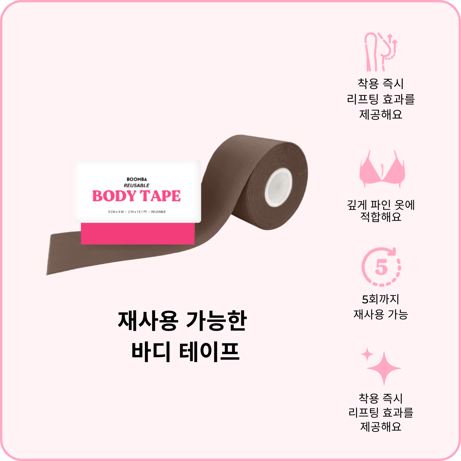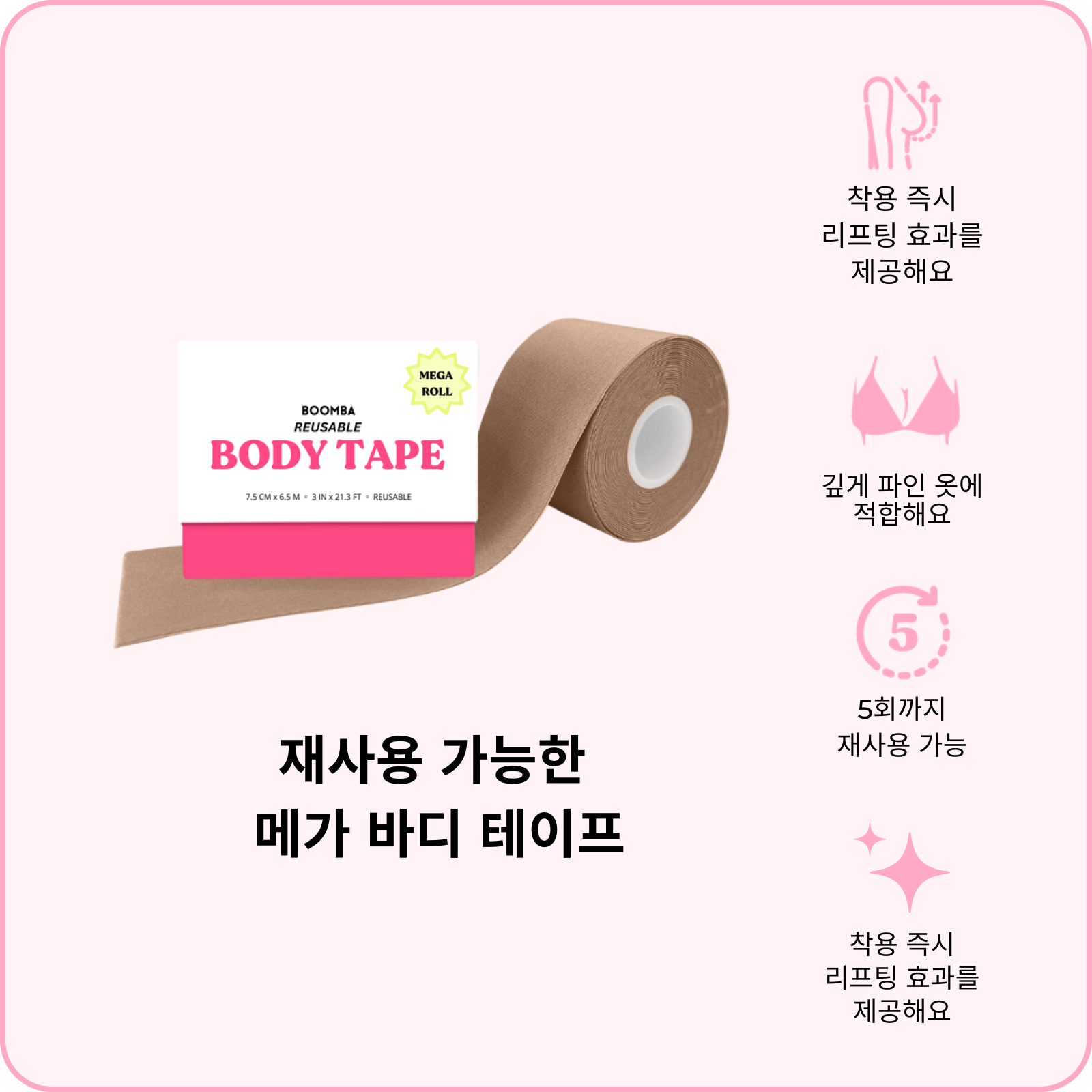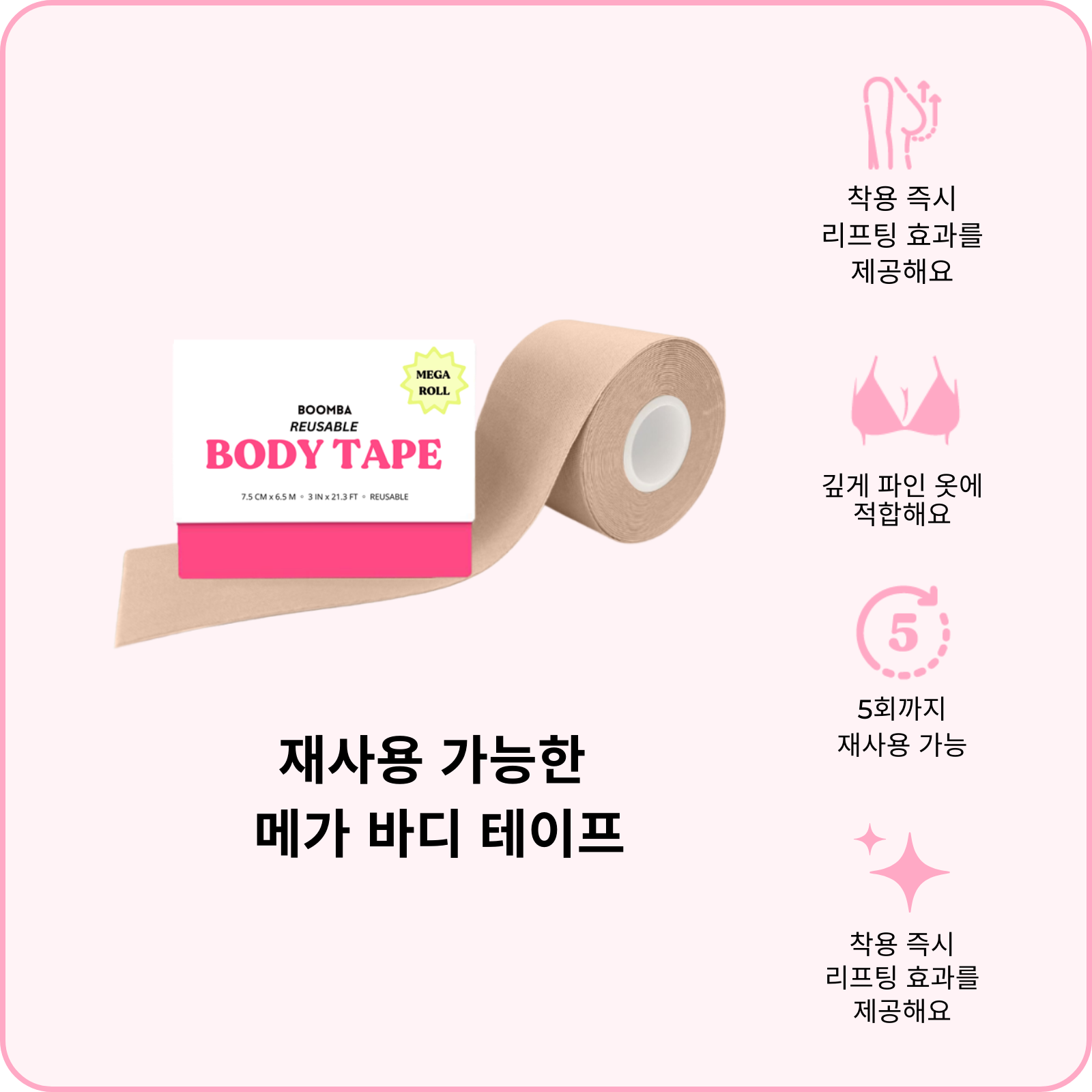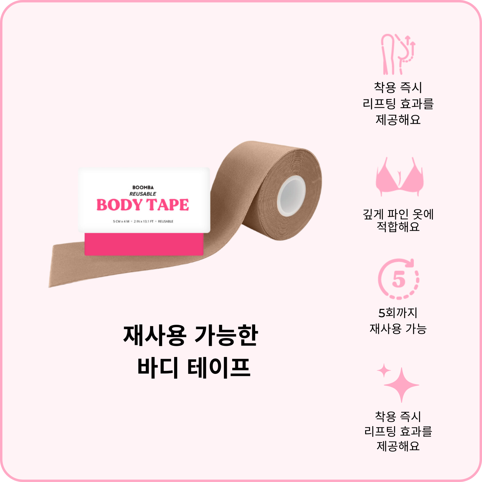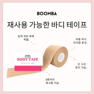 BOOMBA 재사용 가능한 바디 테이프는 5번까지 재사용이 가능합니다. 체형에 맞게 디자인되었으며 부드러우면서도 강력하여 최대 12시간의 지속력을 가지고 있습니다.