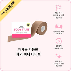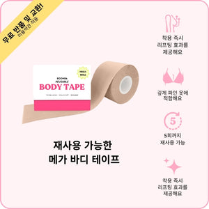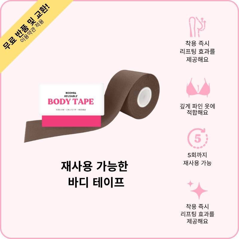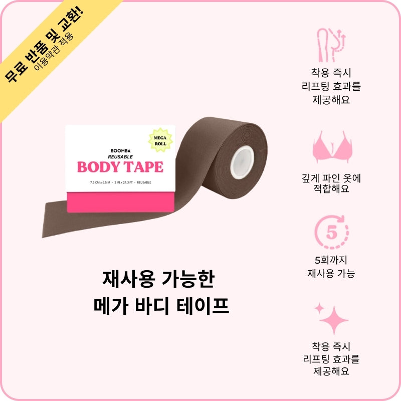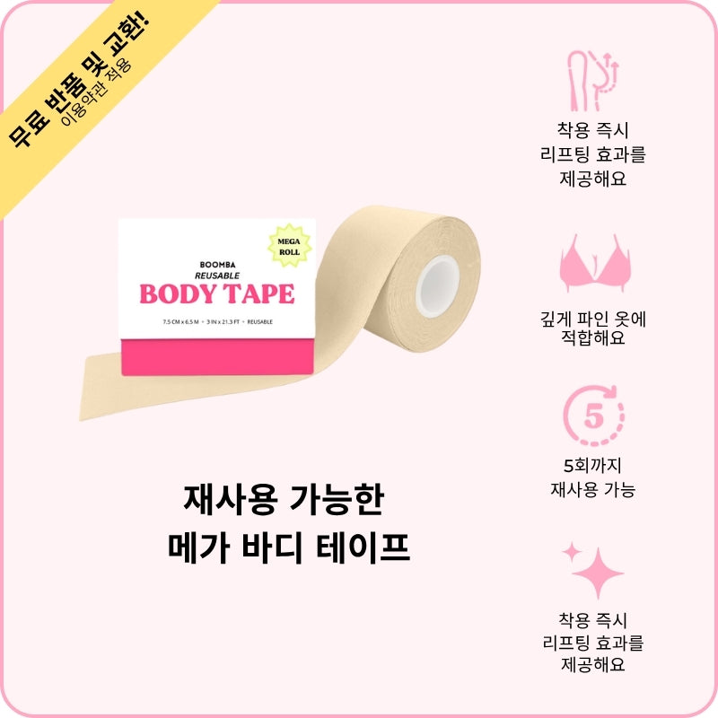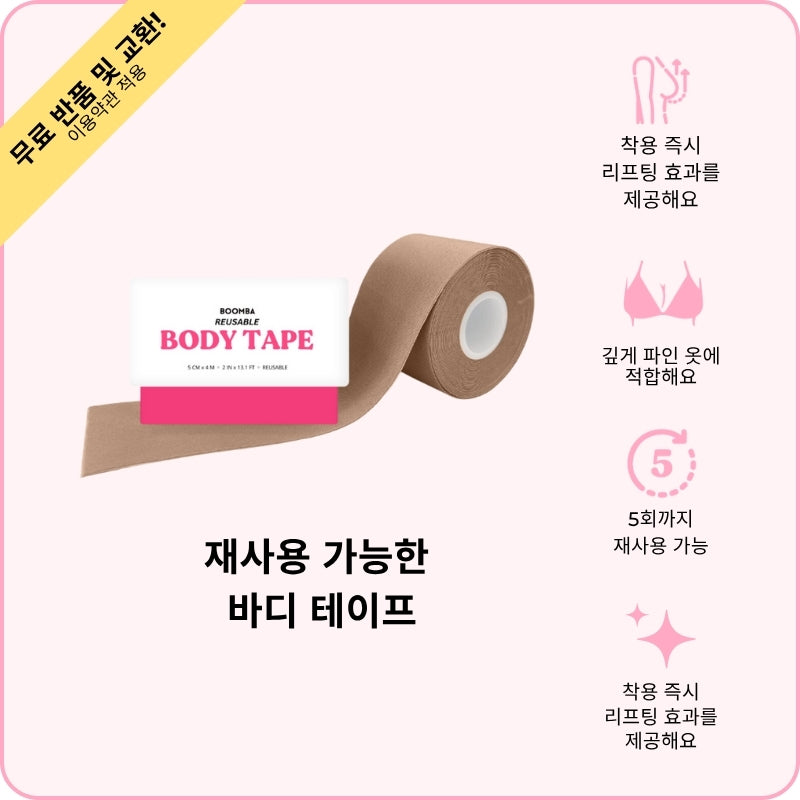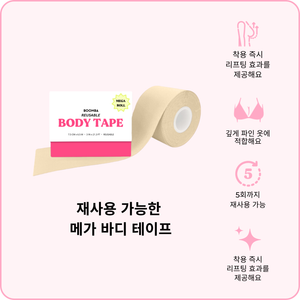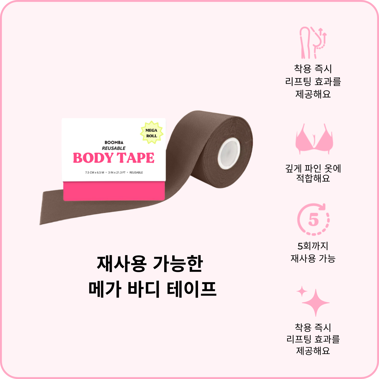 BOOMBA 재사용 가능한 바디 테이프는 5번까지 재사용이 가능합니다. 체형에 맞게 디자인되었으며 부드러우면서도 강력하여 최대 12시간의 지속력을 가지고 있습니다.