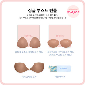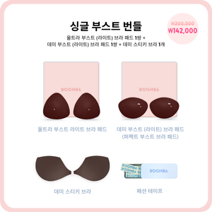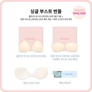 자연스러운 볼륨감을 원하시나요? 싱글 부스트 번들을 여러분을 위해 준비되었습니다! 베스트셀러 울트라 부스트와 데미 부스트 브라 패드의 얇은 버전으로 구성되어 있습니다. 이 라이트 버전은 추가 패드 없이도 눈에 띄는 볼륨감과 리프팅 효과를 줄 수 있습니다. 자연스럽게 착용 즉시 가슴 최대 한 컵까지 볼륨업 가능하고, 매일매일 사용 가능합니다. 은은하면서 강렬한 가슴 볼륨감을 원할 때 완벽한 선택입니다.