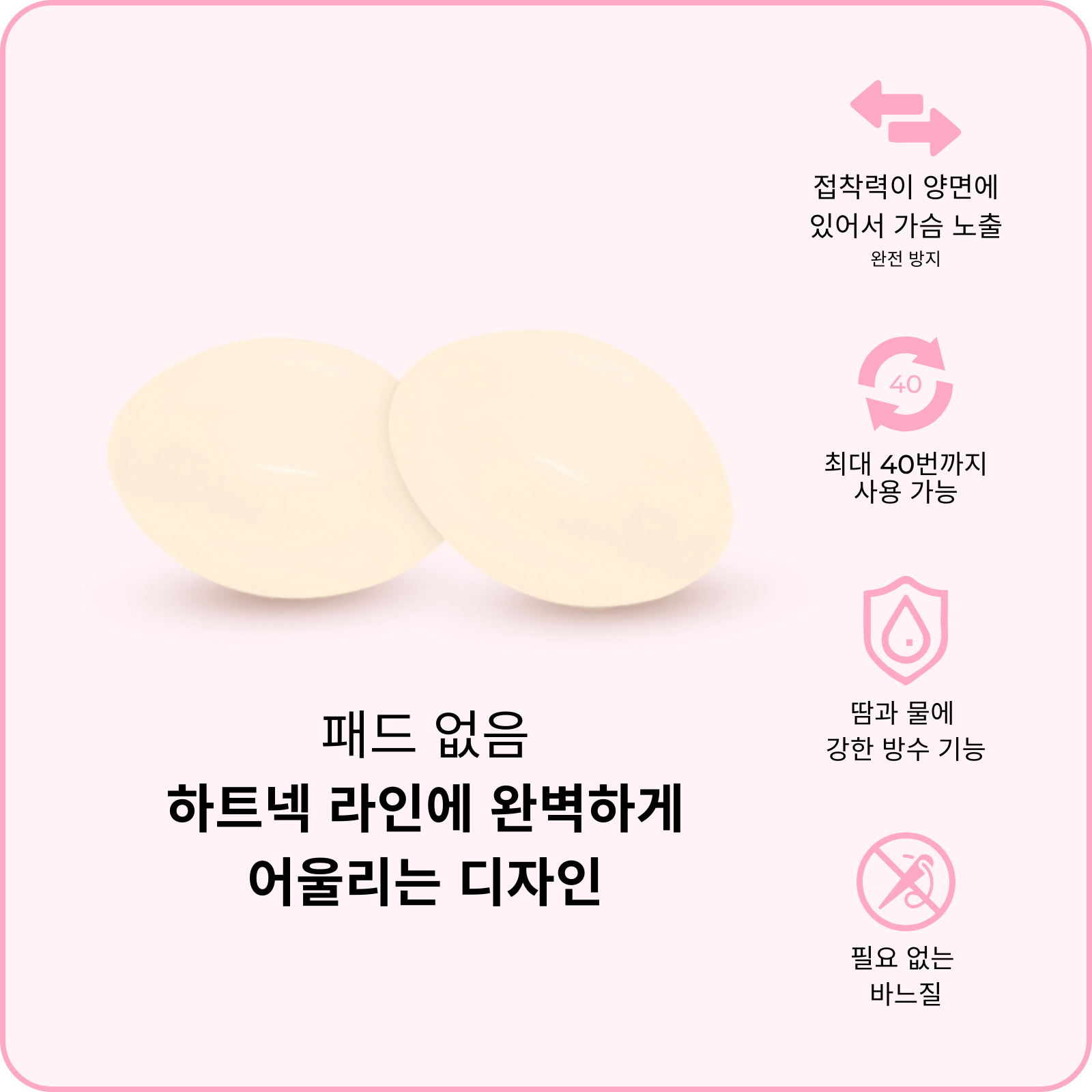 인비지블 리프트 브라 패드 : 얇은 패드로 제작되어, 깊게 파인 옷이나 삼각형 모양의 비키니에 가슴 사이즈는 크게 하지 않으면서 리프팅 효과를 줄 수 있도록 디자인 되었습니다
