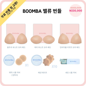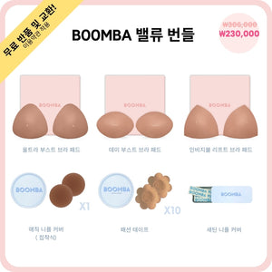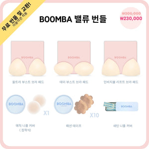 이 번들에는 BOOMBA의 세 가지 인기 브라 패드(울트라 부스트, 데미 부스트, 인비지블 리프트)와 BOOMBA의 베스트 셀러인 매직 니플 커버(접착형), 새틴 니플 커버, 패션 테이프가 모두 포함되어 있습니다.